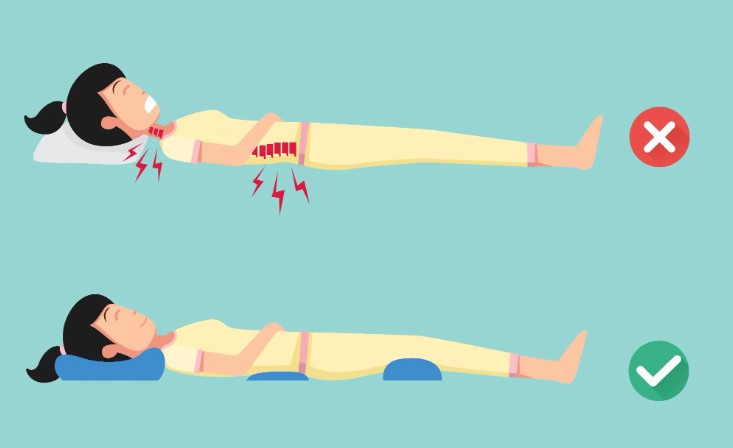 등을 대고 잘 때 허리가 아프다면, 허리 아래에 베개를 넣어보세요. 하지만 너무 두꺼운 베개는 피하세요. 적당한 두께의 베개를 찾아 편안한지 테스트해보세요.